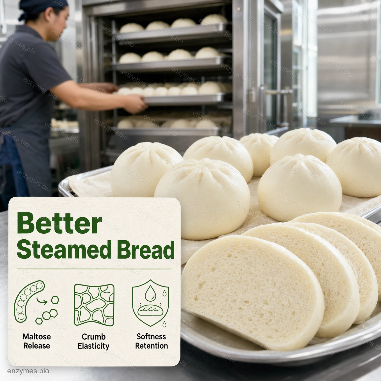 Ångat bröd och brödtillverkning: Förbättring av smulstruktur av bröd och ångat bröd; bättre mjukhet, vithet, elasticitet och smak av ångat bröd; avmattning av åldrande, bättre fuktbevarande och mjukhet, och längre hållbarhet.