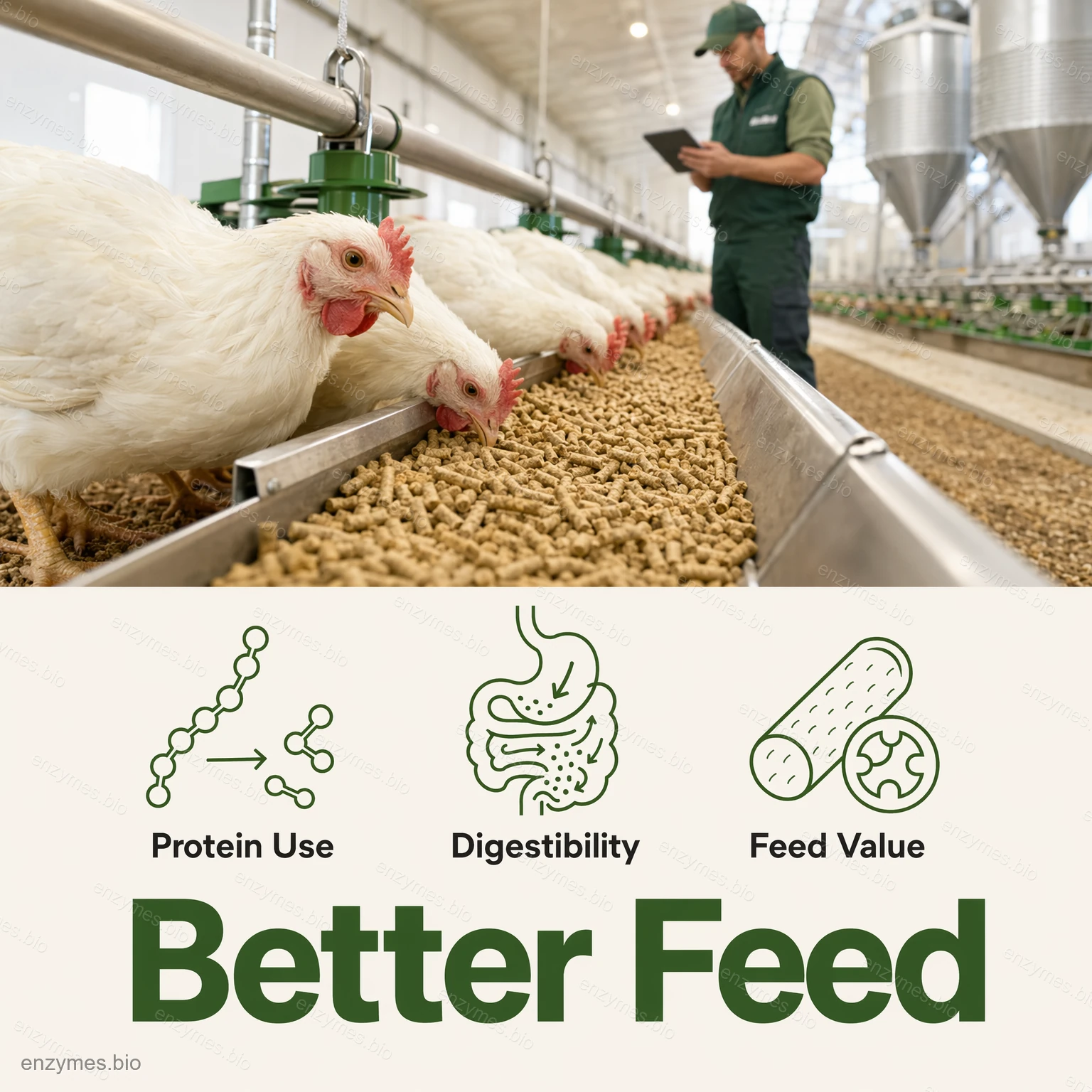 –Foderindustri: Används som fodertillsatser för att utveckla proteinkällor, hjälpa till med absorption, öka foderutnyttjandet, spara kostnader, hjälpa djurens matsmältning och främja tillväxt.