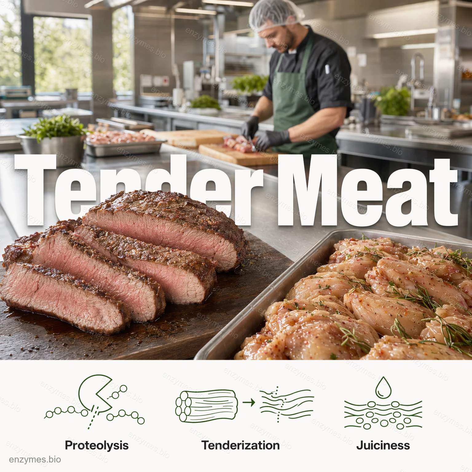 โบรมีเลน เป็นโปรตีนธรรมชาติชนิดหนึ่ง ไม่เป็นพิษ และไม่มีผลข้างเคียง โดยเป็นเอนไซม์ไฮโดรไลซิสซัลฟ์ไฮดริลชนิดหนึ่ง จึงสามารถใช้ไฮโดรไลซ์โปรตีน ไฮโดรไลซ์โซ่เปปไทด์โมเลกุลของโปรตีนเพื่อผลิตโพลีเปปไทด์หรือกรดอะมิโน และสร้างโปรตีนไฮโดรไลเซตที่มีรสชาติเฉพาะตัว
