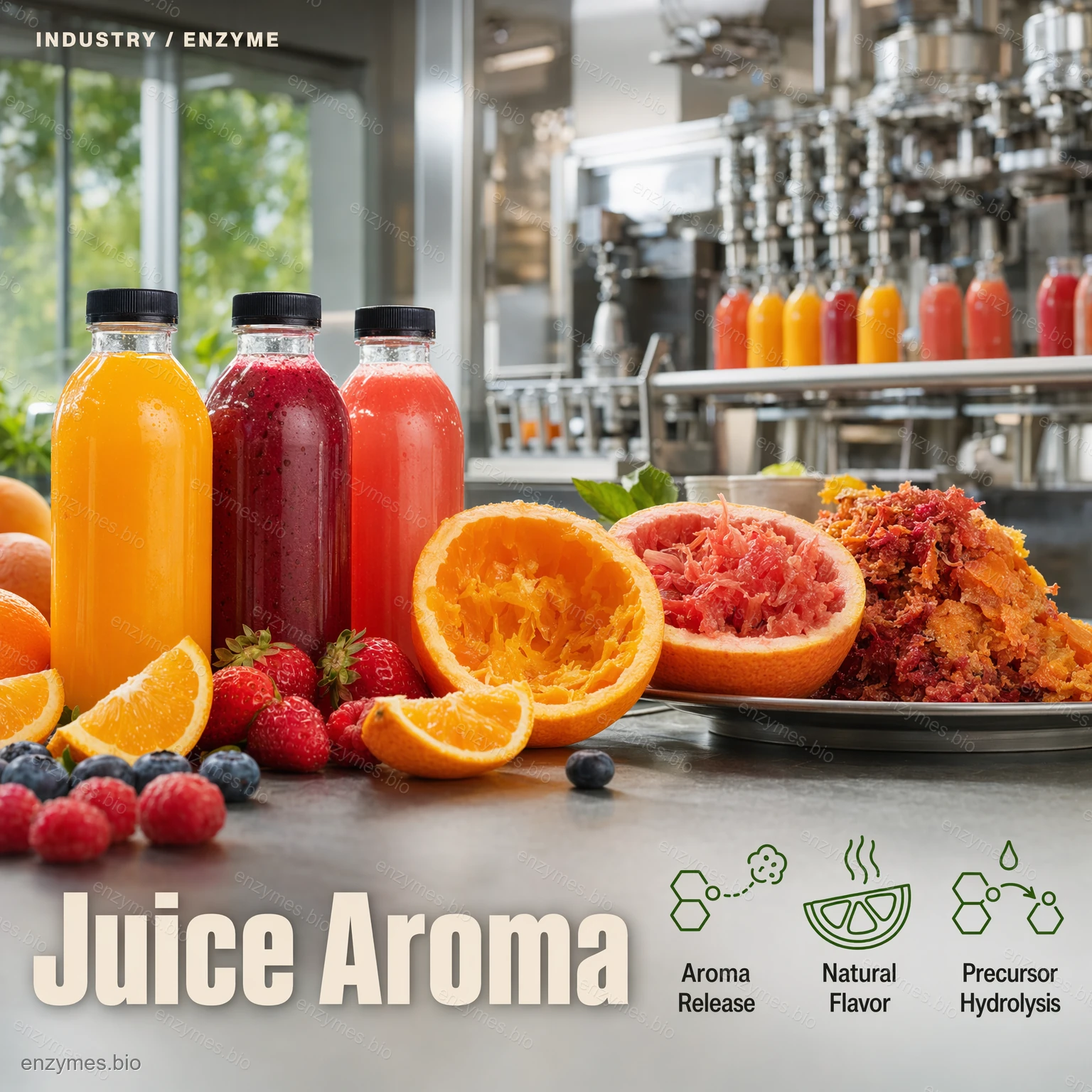 • Used as aromatic components of tea, fruits, vegetables, and flavor enzyme. One part exists as detached form and the other part exists as Flavor precursor substance—β-glucoside. The synergetic effect of BGL and other flavor enzyme on β-glucoside is to release volatile glocoside aglycon to enhance aroma and improve the natural flavor of fruit juice.