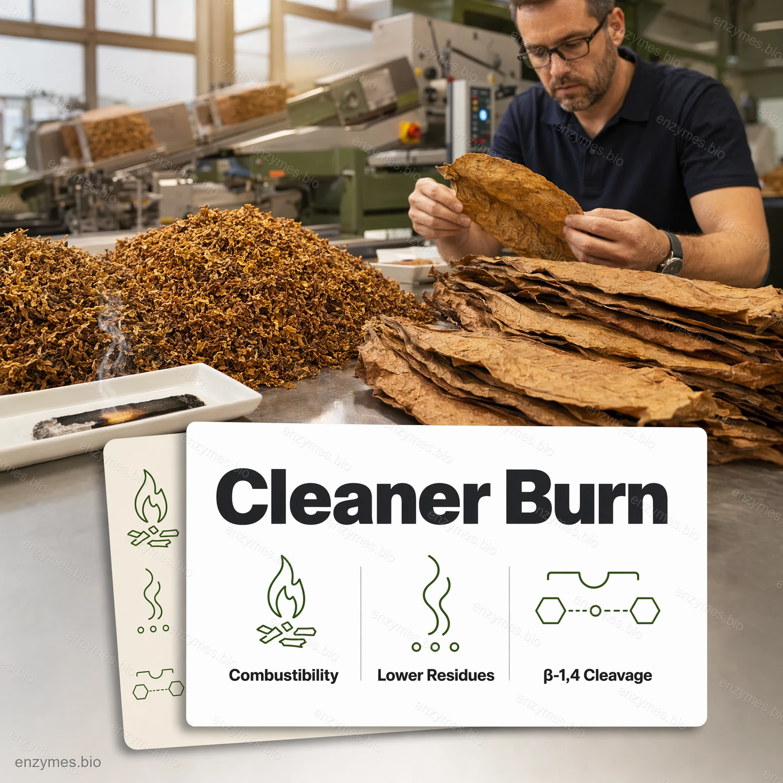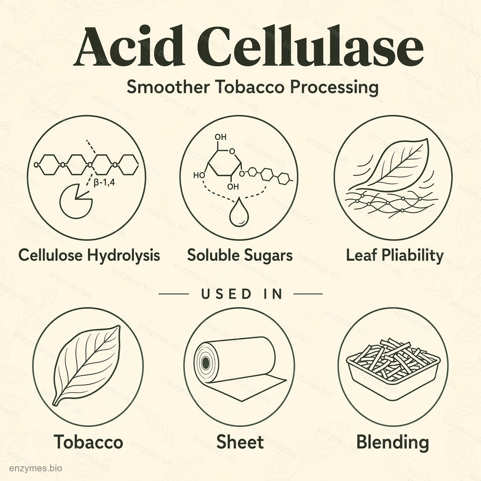 纖維素在煙草葉子的植物細胞壁中佔了很大的比例。過多的纖維素會導致燃燒性質變差,並因為燃燒不完全和過多的熱解殘留物而產生刺鼻的刺激性煙霧。酸性纖維素酵素的作用是酵素水解纖維素和半纖維素中的β-1,4-糖苷鍵,將它們轉換成較短的寡糖鏈和水溶性糖。這種轉換不僅減少了吸食過程中多環芳香族碳氫化合物 (PAH) 和其他不良化合物的形成,還有助於煙草的天然甜味和香味。.