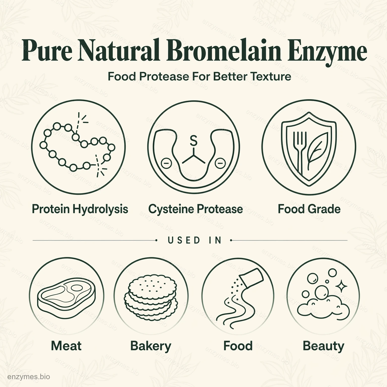 鳳梨蛋白酶是一種用途廣泛的蛋白酶,純天然且無毒。它廣泛應用於食品加工、蛋白質水解以及作為酵素製劑的成分。鳳梨蛋白酶是一種用途廣泛的蛋白酶,可用於食品加工、蛋白質水解以及作為酵素製劑的成分。食物中的蛋白質可被鳳梨蛋白酶水解成小分子勝肽或胺基酸,因此鳳梨蛋白酶可製成肉類嫩化劑、餅乾軟化劑以及用於食品加工的其他用途。在化妝品和個人護理產品配方中添加鳳梨蛋白酶,可為清潔產品提供酵素去角質和蛋白質消化功能。.