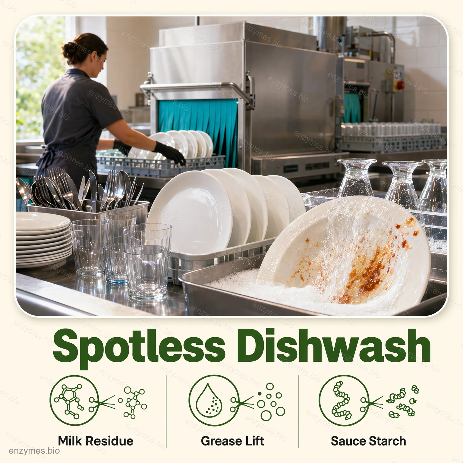 - Багатоферментне розкладання: Ферментний комплекс розщеплює білки, олії, крохмаль та рослинні полісахариди на розчинні або легко диспергуючі дрібні молекули в мийному розчині. Завдяки емульгуванню та диспергуванню поверхнево-активними речовинами в поєднанні з механічною дією плями відокремлюються від тканин та посуду для ретельного очищення.