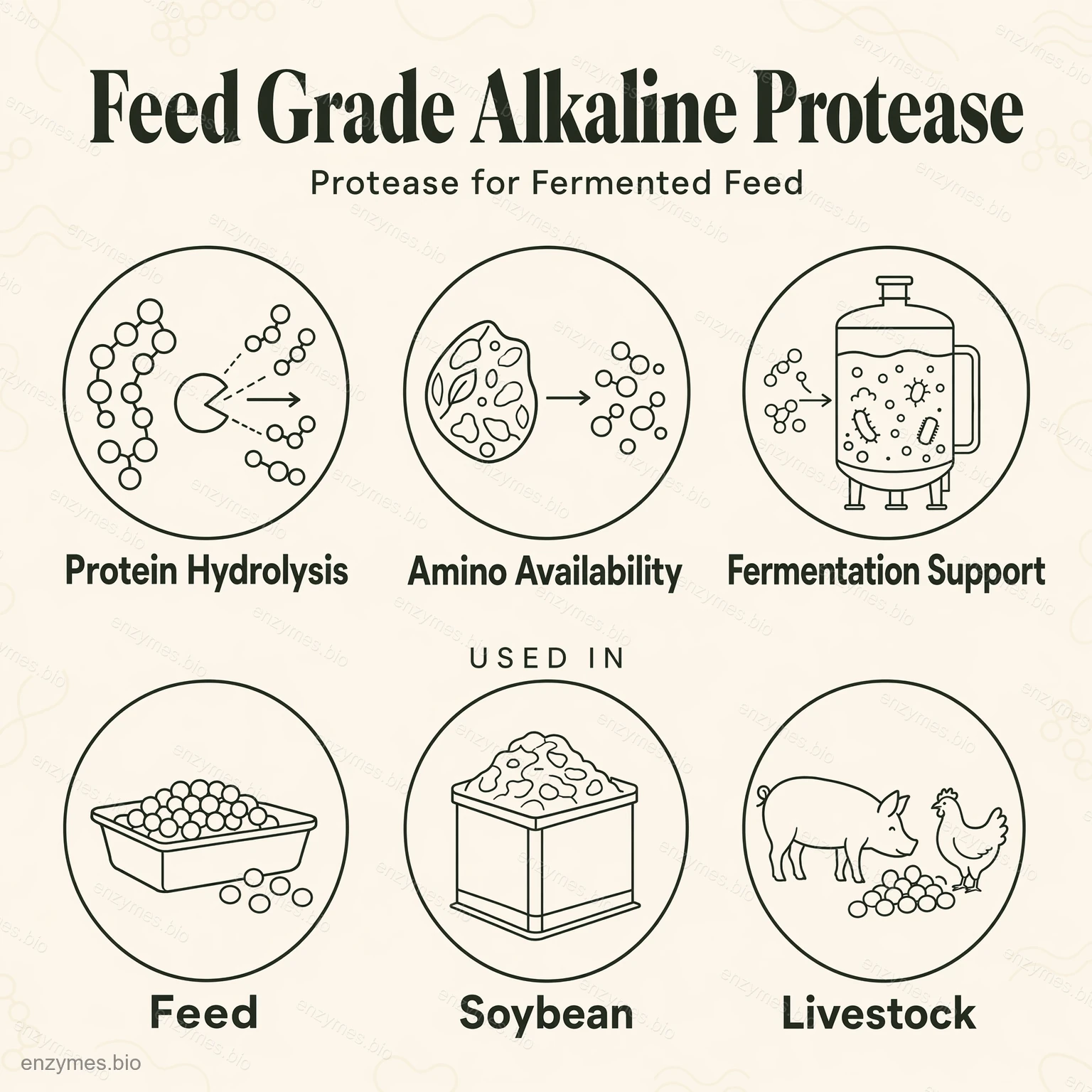 Окрім виробництва ферментованого соєвого шроту, цю лужну протеазу кормового класу також можна застосовувати до інших високобілкових рослинних субстратів, таких як ріпаковий шрот, бавовняний шрот, арахісовий шрот, соняшниковий шрот та подібні багаті на білок матеріали. Прискорюючи гідроліз білка, фермент допомагає вивільняти невеликі пептиди та амінокислоти, покращуючи доступність поживних речовин для мікробної ферментації. Це підтримує більш стабільну продуктивність ферментації та сприяє покращенню засвоюваності та харчової цінності ферментованих рослинних білкових інгредієнтів. Примітка: Норма внесення та продуктивність можуть відрізнятися залежно від типу сировини, складу білка та умов ферментації. Для оптимізації рекомендуються пілотні випробування.