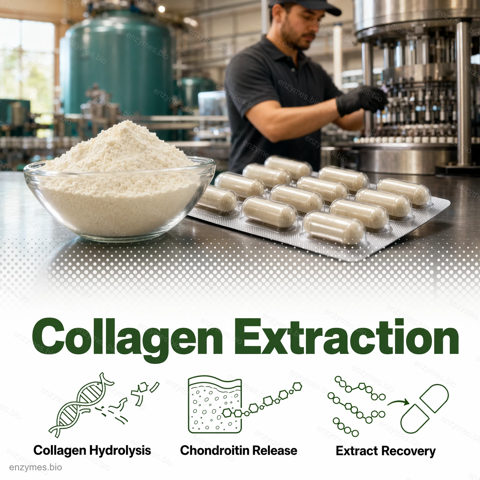 - Екстракція хондроїтину сульфату: ефективний гідроліз сировини для вивільнення хондроїтинсульфату.