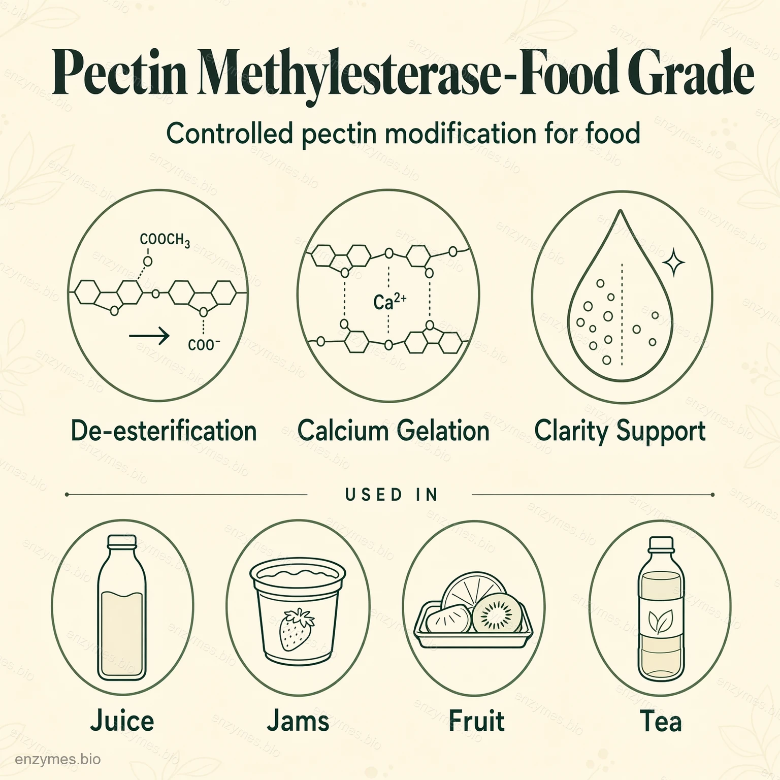 Завдяки цьому процесу PME зміцнює структуру клітинних стінок у фруктах і овочах, допомагаючи зберегти твердість і зменшити розм'якшення під час зберігання. У виробництві соків і чайних напоїв обробка ПМЕ розщеплює пектин, відповідальний за помутніння, що призводить до отримання більш прозорих і стабільних продуктів. У виробництві пектину вона забезпечує ефективне перетворення HM-пектину в LM-пектин для використання в джемах, желе та інших продуктах, що вимагають специфічних желюючих властивостей.