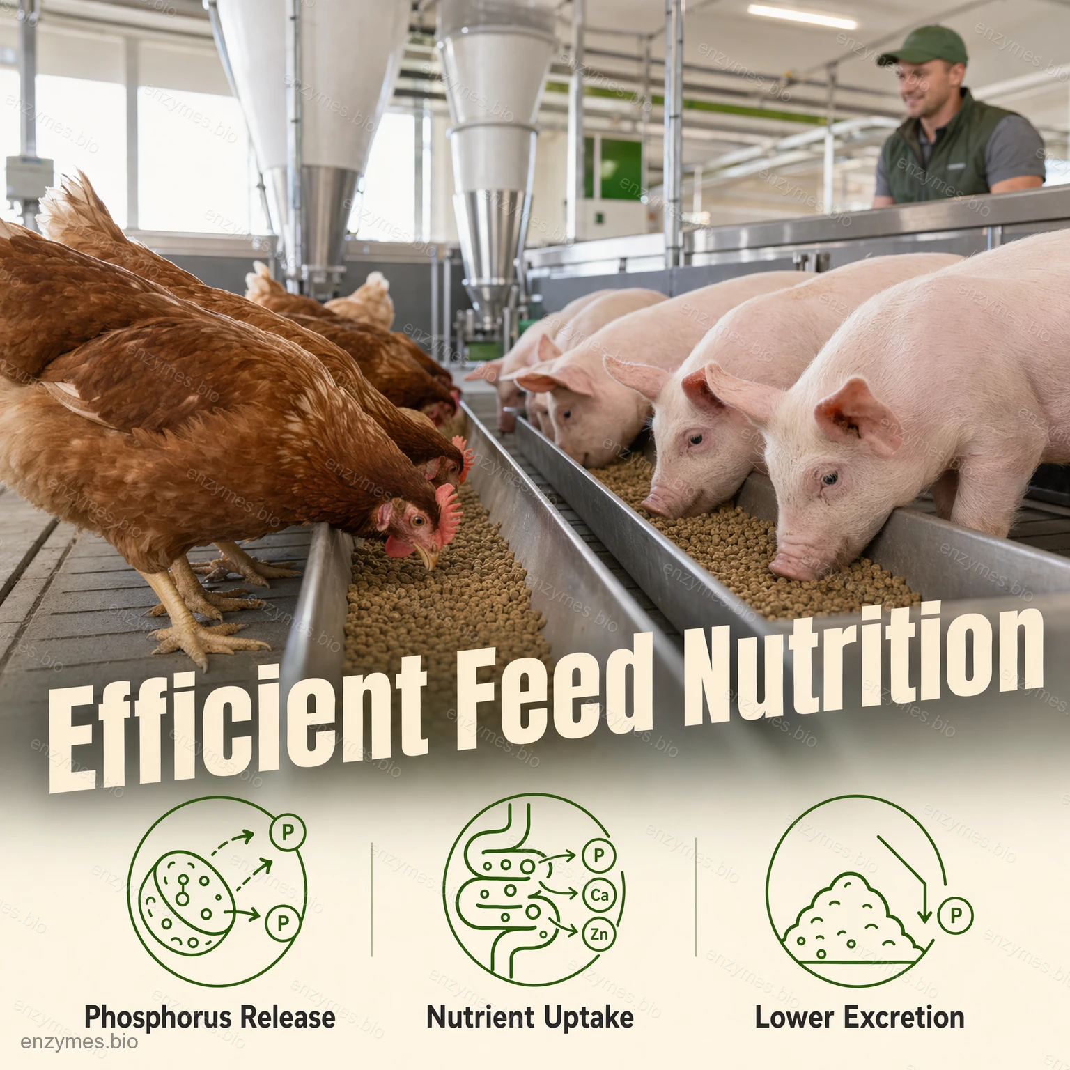 - Знижує вміст фосфору, зв'язаного з фітатами, та підвищує ефективність використання фосфору в кормі.