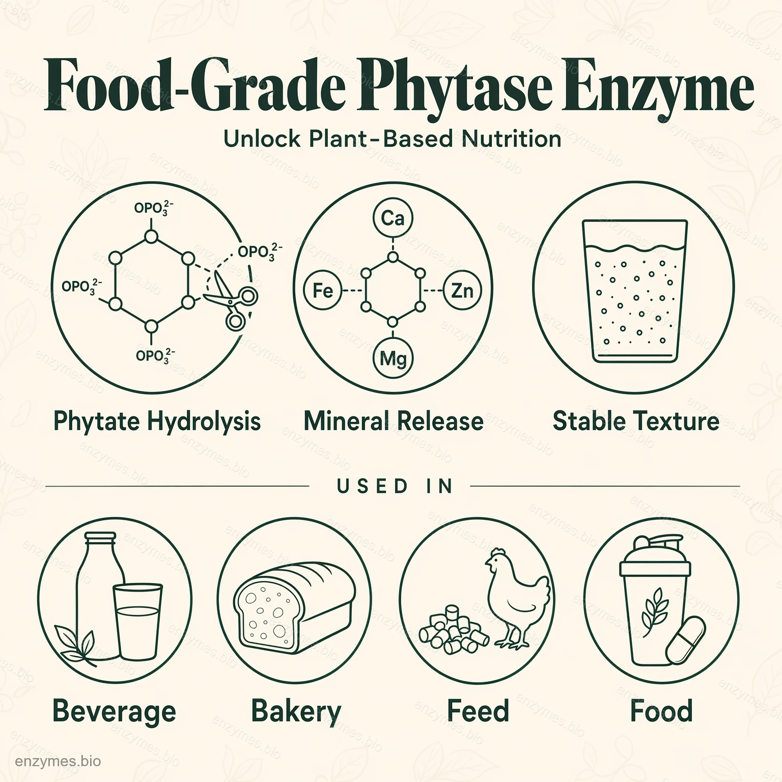 Фітаза харчового класу — це високоефективний біологічний фермент, призначений для гідролізу фітинової кислоти (інозитолгексакісфосфату), що природно міститься в зернових, бобових, олійних та інших рослинних сировинах. Фітинова кислота утворює міцні комплекси з мінералами, такими як кальцій, залізо, цинк і магній, що знижує їх біодоступність. Поступово вивільняючи фосфатні групи з молекули фітинової кислоти, фітаза значно покращує засвоюваність і поживну цінність рослинних інгредієнтів.
