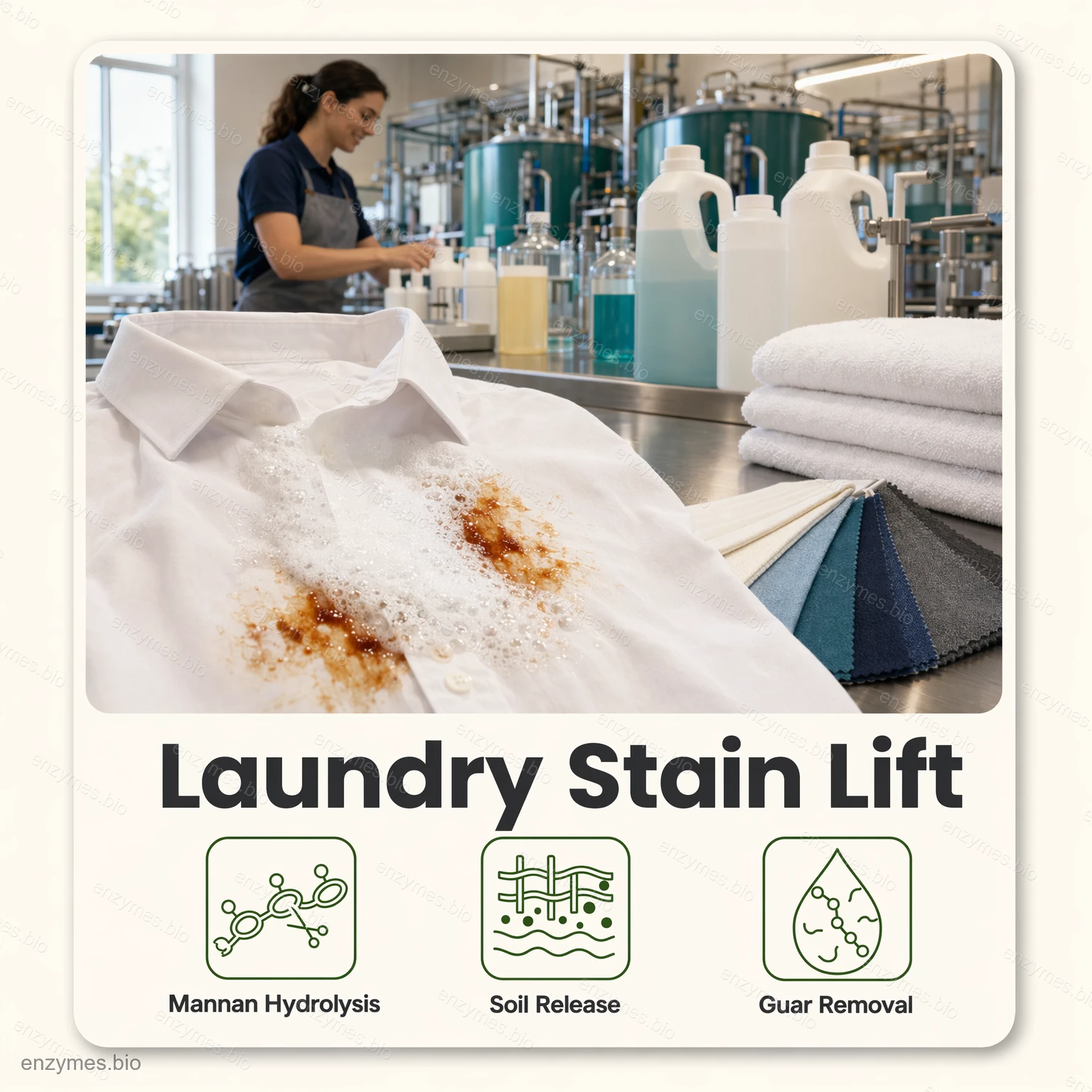 Bằng cách phân hủy các cấu trúc mannan phức tạp thành các phân tử đường nhỏ hơn, hòa tan trong nước, enzyme này giúp tăng cường khả năng tẩy vết bẩn, hỗ trợ làm sạch sợi vải sâu hơn và giúp chất tẩy rửa hoạt động hiệu quả hơn trong nhiều điều kiện giặt khác nhau.
