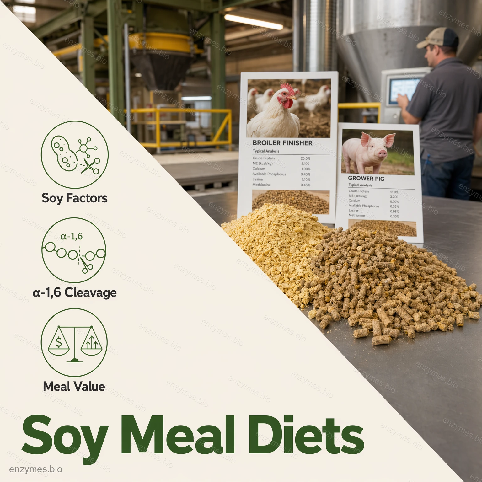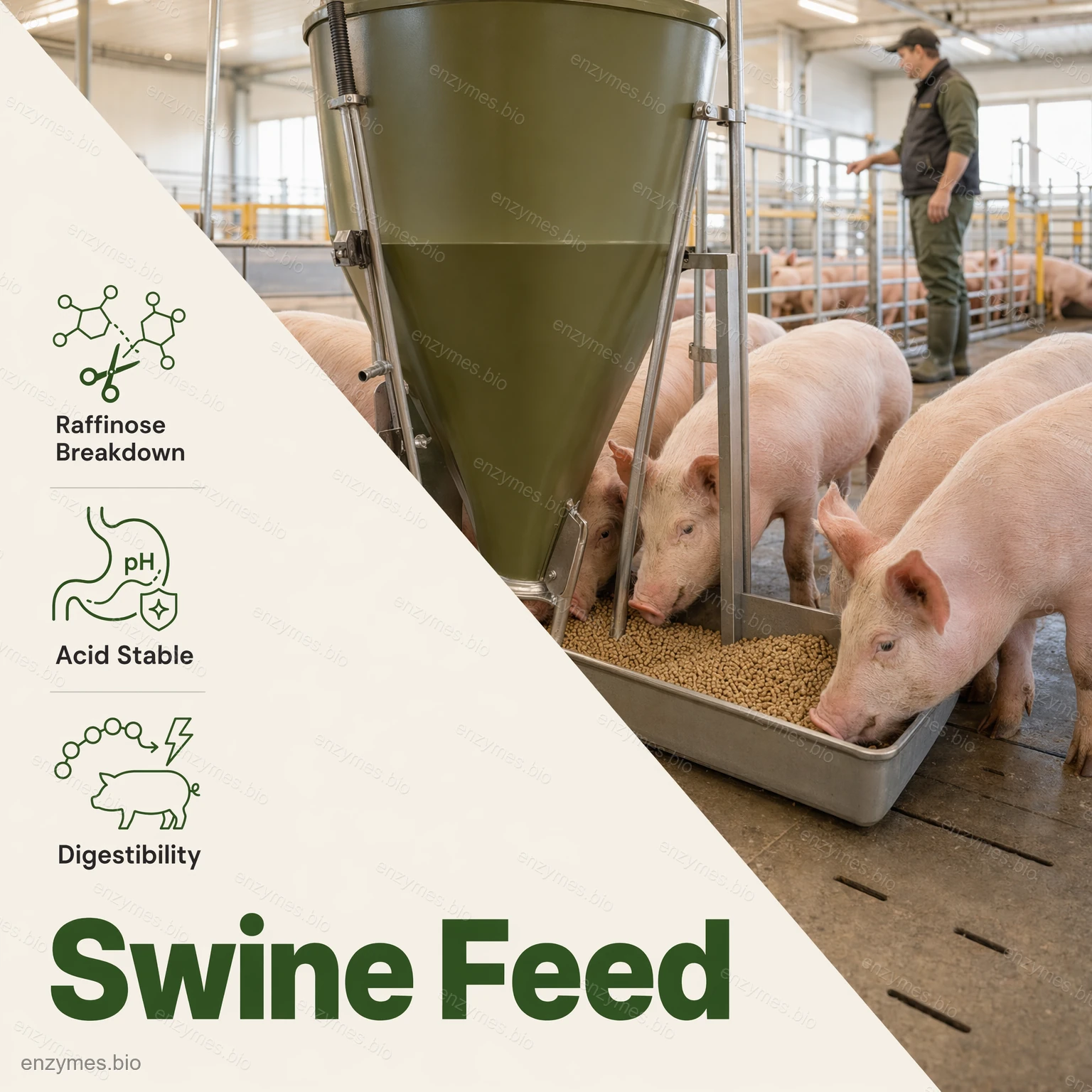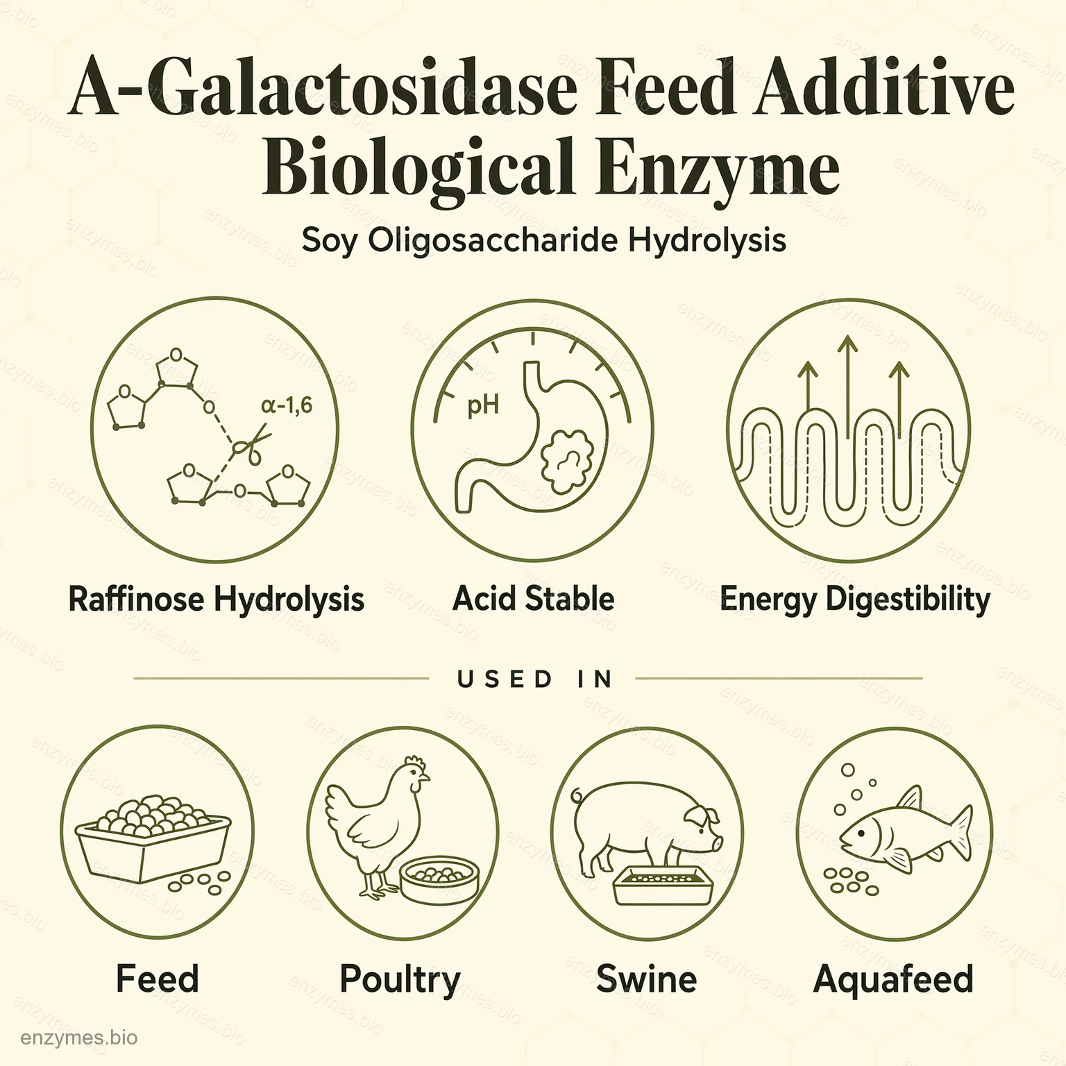 Alpha-galactosidase có thể xúc tác quá trình thủy phân các oligosaccharide như mật ong, đường hạt bông và hydrosugar, cũng như galactomannan và galacturonic acid glycan. Bằng cách thủy phân α-galactose chứa đựng Liên kết glycosidic α-1,6, nó có thể đạt được hiệu quả loại bỏ các yếu tố chống dinh dưỡng.