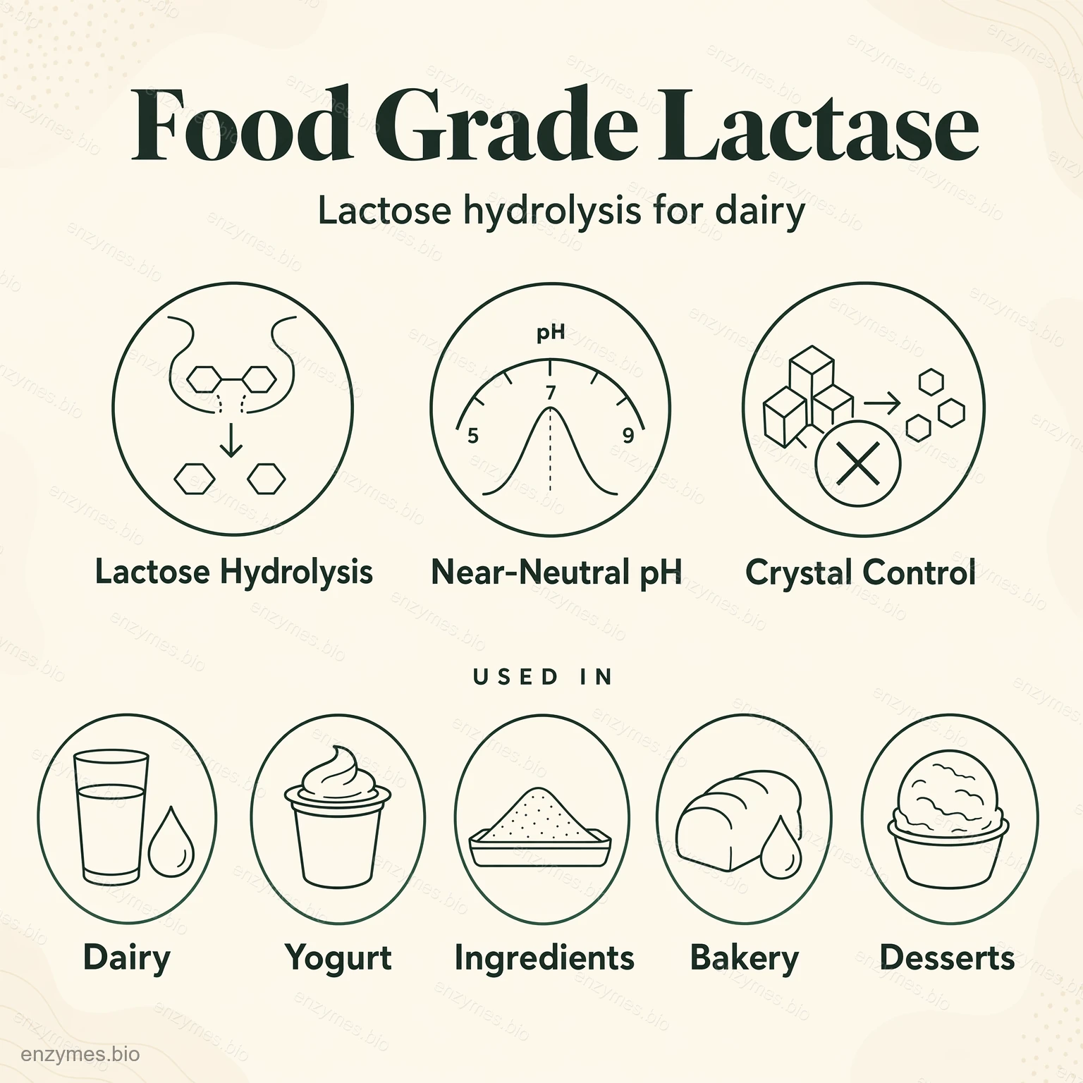 Với hoạt tính tối ưu trong khoảng pH gần trung tính, enzyme này rất phù hợp cho Sữa và chế biến sản phẩm sữa, cho phép sản xuất hiệu quả hàm lượng lactose thấp Và Không chứa lactose sản phẩm.