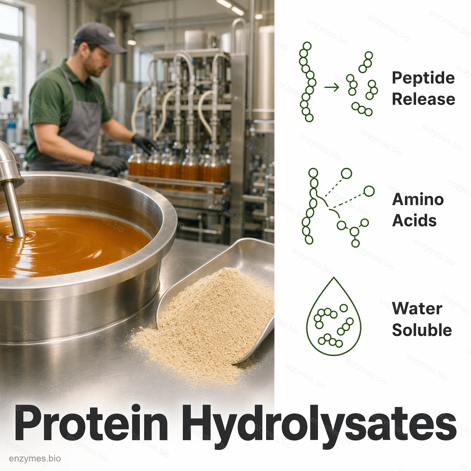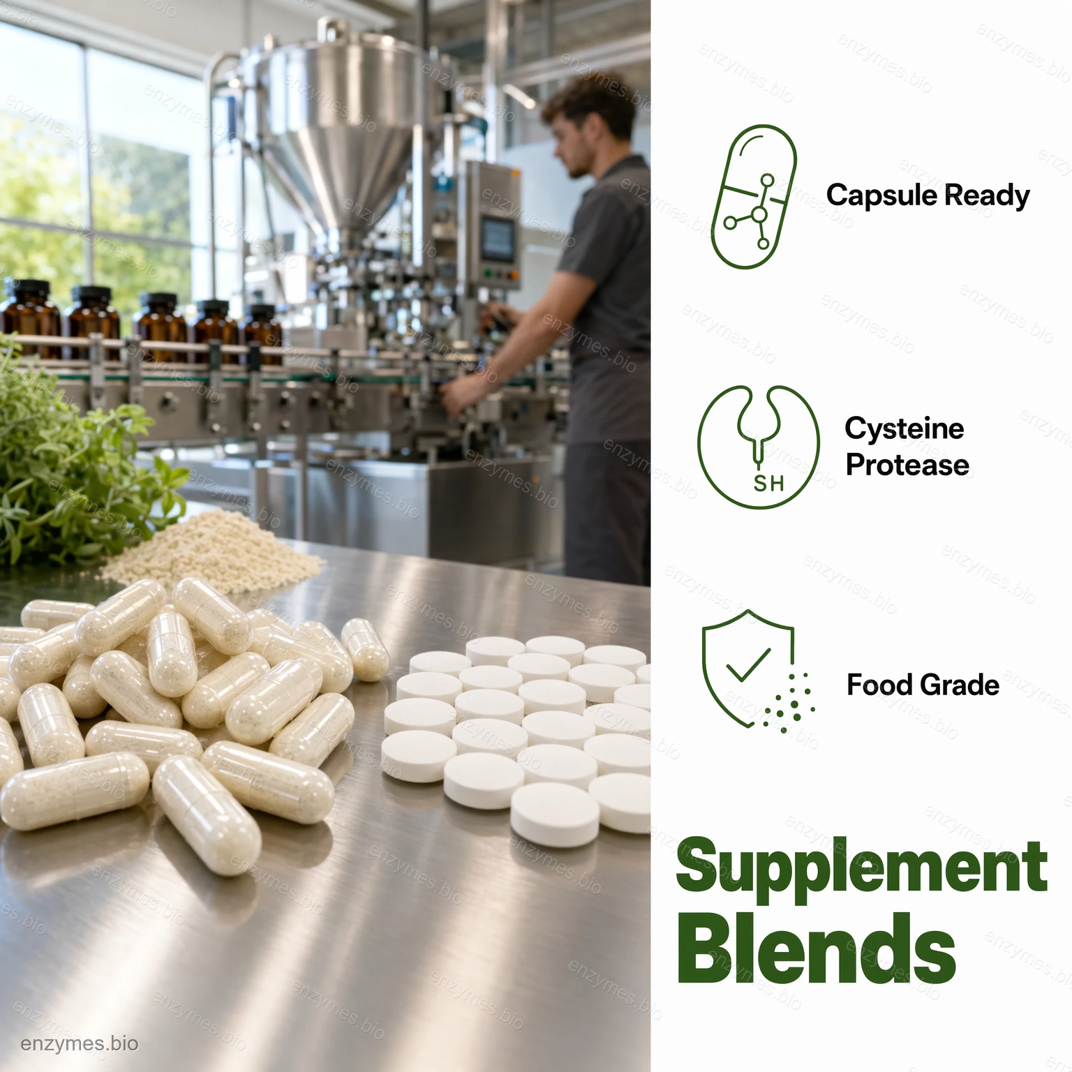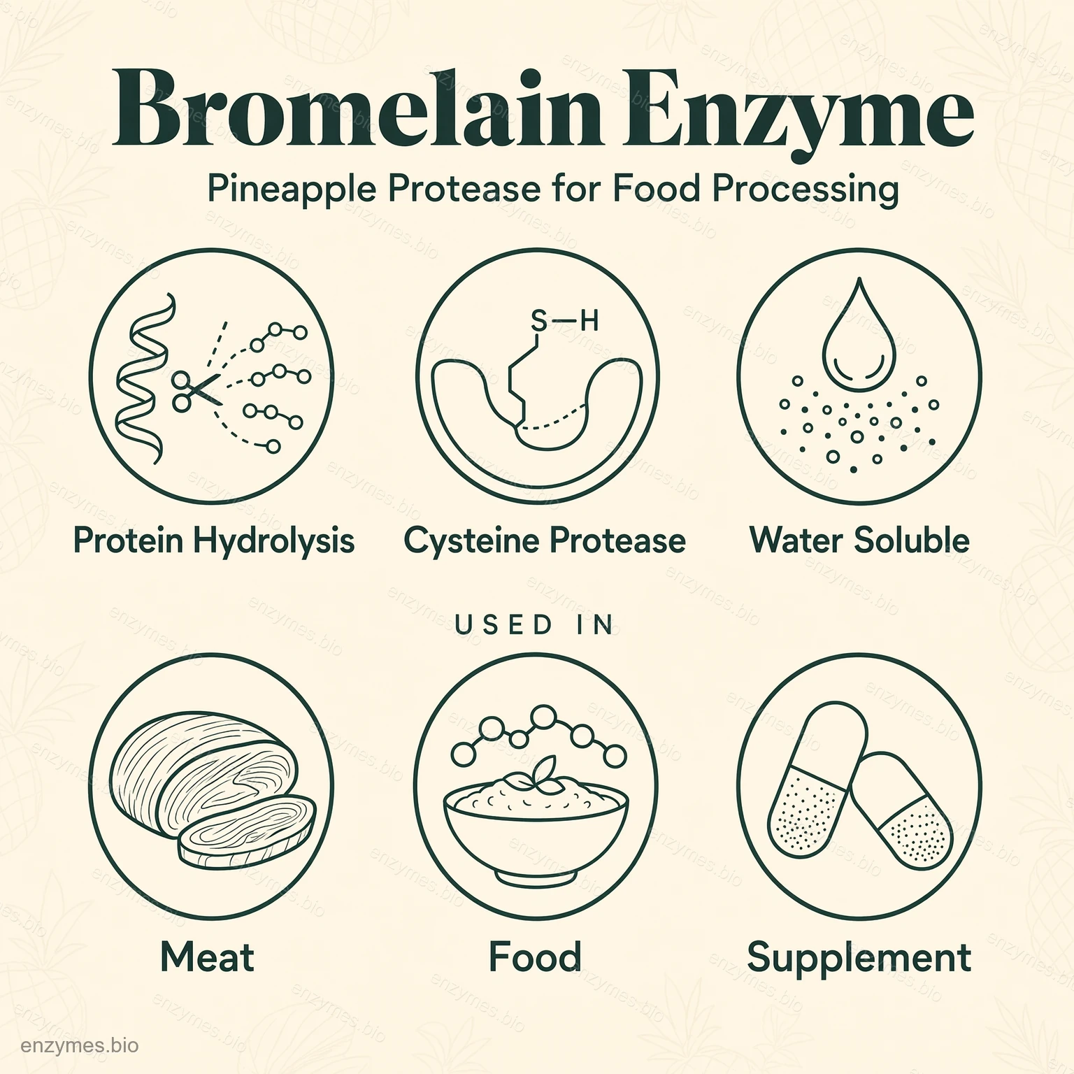 Bromelain là một loại protein tự nhiên, không độc hại và không có tác dụng phụ. Là một protease thủy phân sulfhydryl, nó có thể được sử dụng để thủy phân các phân tử protein, sản xuất polypeptide hoặc axit amin và tạo ra protein thủy phân có hương vị độc đáo.