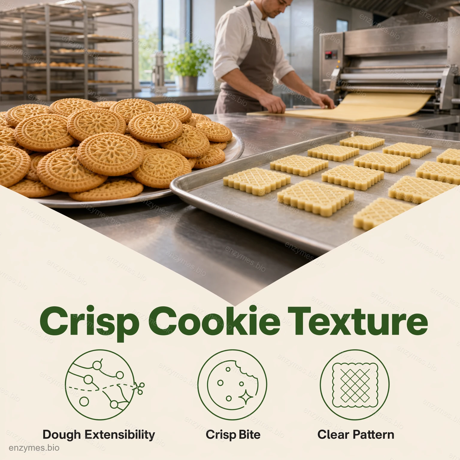 - In the baking industry, neutral protease is used to make cookies, reducing mixing and fermentation times of dough. The enzymatic reaction weakens the dough’s strength, improving plasticity and extensibility, resulting in clear and beautiful printing patterns, enhanced gloss, uniform structure, and a crisp taste.